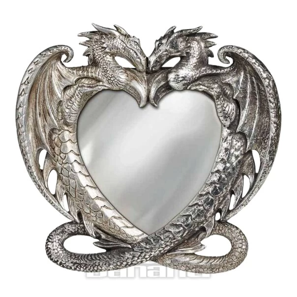 The Alchemy Dragon’s Heart Mirror in Silver. This compact gothic hand mirror is designed with two dragons entwined to form the mirror frame. Complete with a silver effect finish, this mirror is sure to look right at home in any gothic abode. This mirror can either be free standing or hung on the wall. The choice is yours.