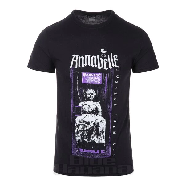 Any horror fan will recognise this creepy character! The Annabelle T-shirt features the scary doll locked in her showcase with ‘Possess Them All’ text.