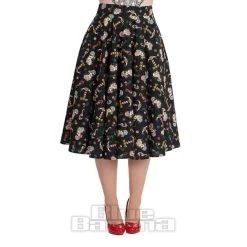 The Banned Anchor Pin Up Dress in black. This A-line skirt compliments any rockabilly style. With fun nautical print, you won’t want to miss out on this alternative midi skirt!