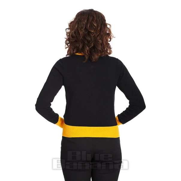 The Banned Black Panther Cardigan in Black. Available in sizes S – 4XL. This classic cardigan features panther embroidery to the front trimmed with yellow. Pair with all kinds of fashion styles from rockabilly to alternative.