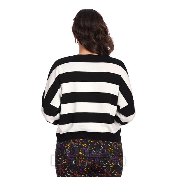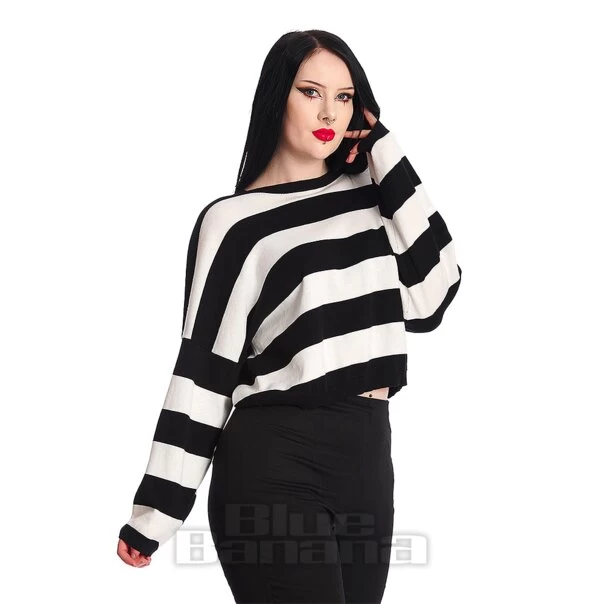 The Banned Mordecai Jumper in Black/White. Available in sizes UK S to UK XL. This cropped jumper features a black and white striped style with drop shoulders. Pair this winter jumper with a pair of skinny jeans and boots for an alternative look.