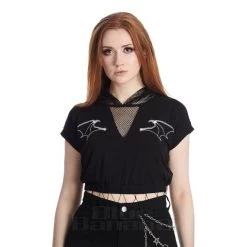 The Banned Ombra Hoodie in Black. This super cool cropped hoodie featuring a netted neckline and hood and printed bat wings is sureto elevate your Gothic look even more.