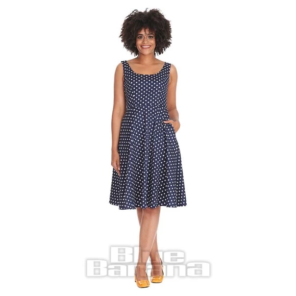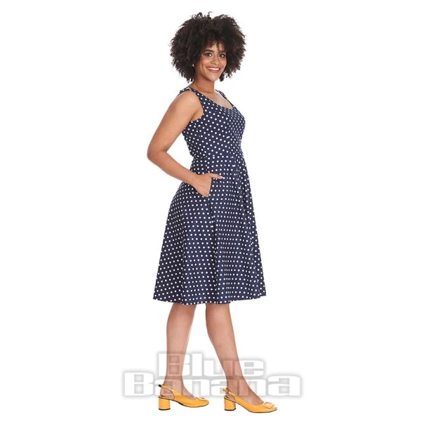 Freshen your vintage wardrobe with the Banned Polka Dot Swing Dress in Navy. Featuring a polka dot print with pockets and a heart cut-out on the back.