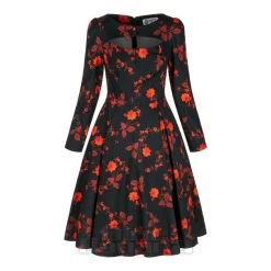 Add a retro feel to your wardrobe with this stunning red floral midi dress from Bleeding Heart. Complete with flared skirt, fitted bodice, long sleeves and cutout detail.