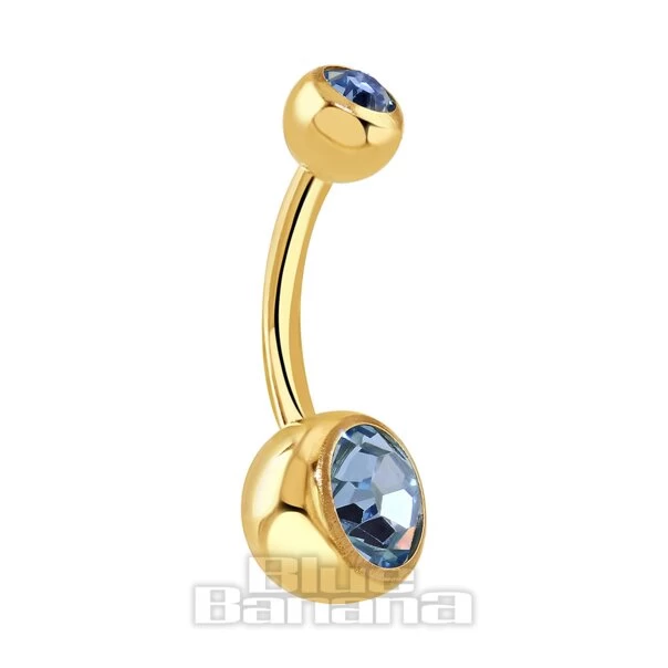 Be the first to review “Blue Banana Plasma Gold 1.6mm Double Jewelled Navel Bar (Aqua)” Cancel reply