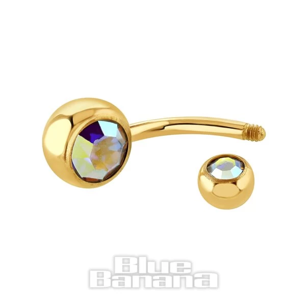 Be the first to review “Blue Banana Plasma Gold 1.6mm Double Jewelled Navel Bar (Aurora Borealis)” Cancel reply