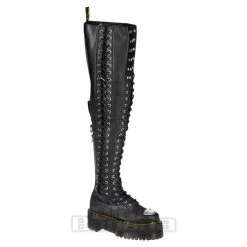 The Dr Martens 28-Eye XTRM Max Virginia Knee-High Platform Boots in Black. Towering with a 28-eyelet lacing system these thigh-high boots are sure to create an unmissable look. These boots are also complete with the raised Quad Maxx soles and metal toe box detailing.