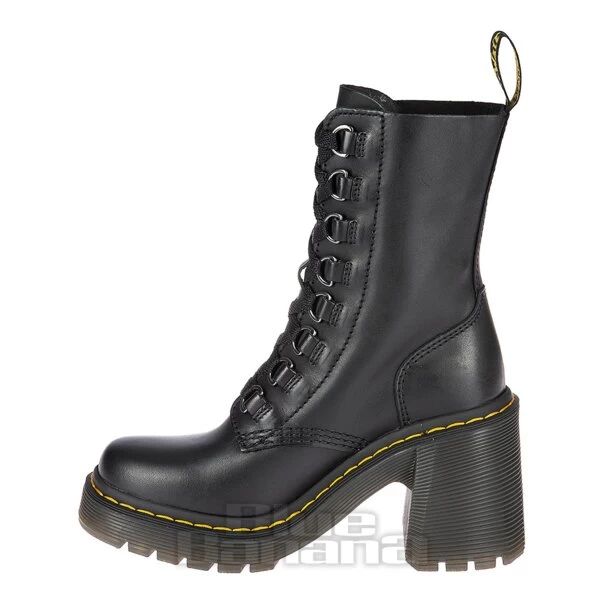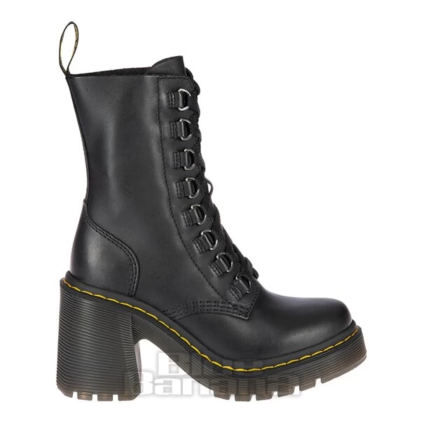 The Dr Martens Chesney Sendal Ankle Boots in Black. These heeled boots feature a lace-up front, 3.4″ heel, and smooth leather finish.