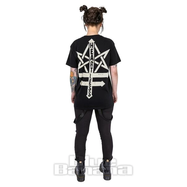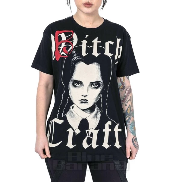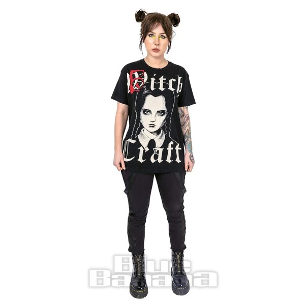 The Heartless Bitch Craft T-Shirt in Black. Available in sizes UK S to UK XXL. This regular fit t-shirt features a Wednesday Addams character on the front with “Bitch Craft” text and Heartless branding on the back. Add this to your alternative t-shirt collection.