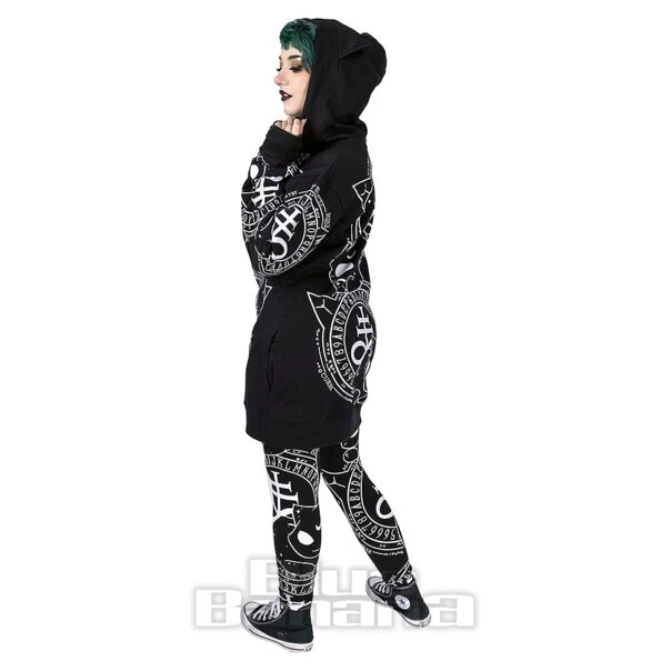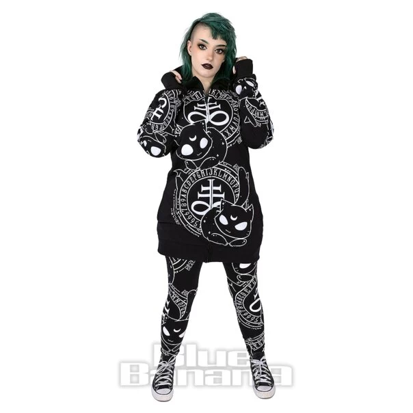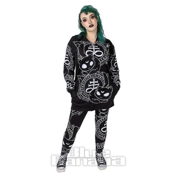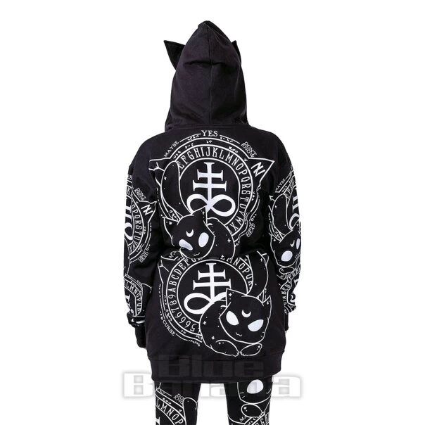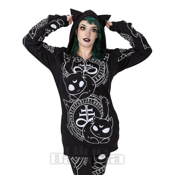 Heartless Cat Craft Hoodie in Black/White. Available in sizes S to XXL. Featuring a witchy cat design with gothic symbols and cat ears on the hood. Perfect for any alternative wardrobe.