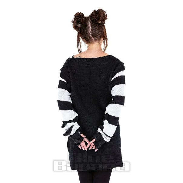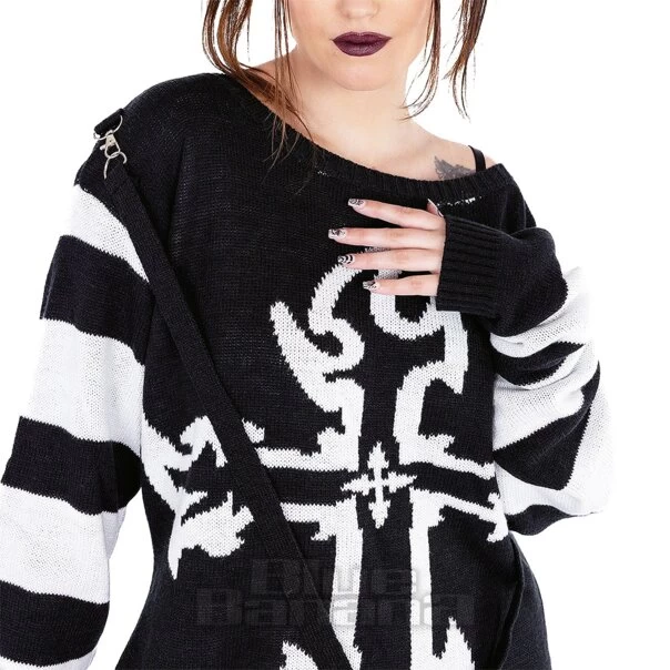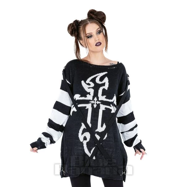 Embrace winter with style and choose the Heartless Lilith Jumper. Featuring striped sleeves, detachable straps and cross print.