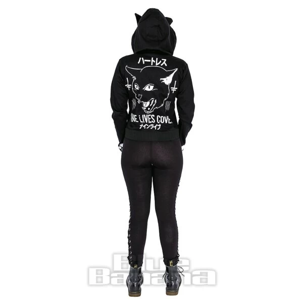 The Heartless Nine Lives Jacket in Black. Available in sizes XS – XL. This Gothic hoodie features a cat graphic to the back paired with cute cat ears to the hood. This is completed with text to the front and back of the jacket. Perfect for pairing with your alternative or witchy fashion.
