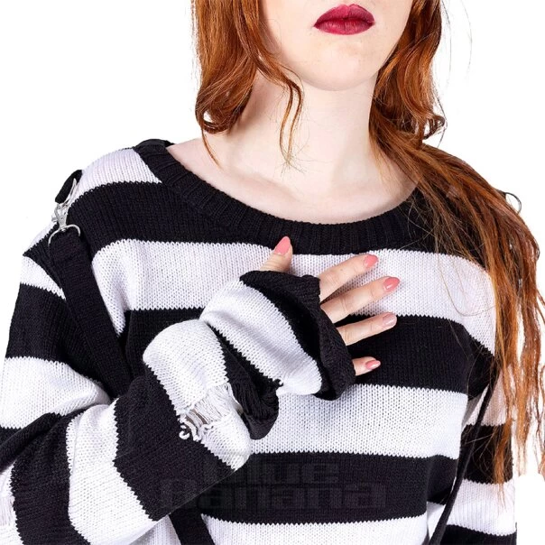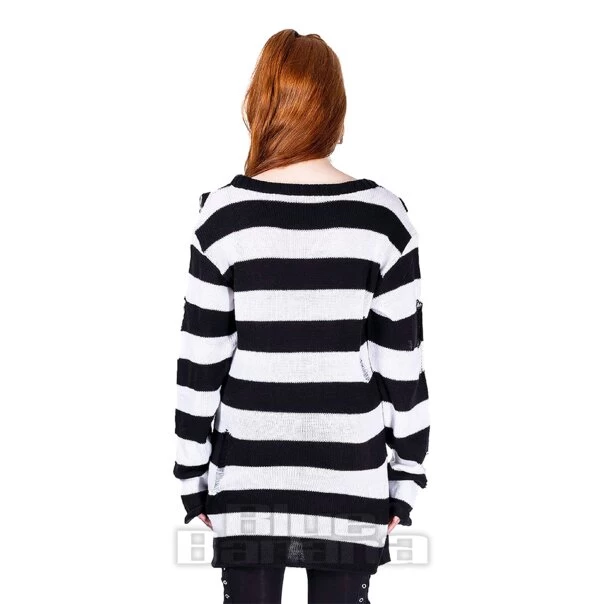 The Heartless Oriana Jumper in black and white. Get cosy with this stripe oversized sweater from Heartless clothing. The Oriana jumper would make a great addition to any alternative winter wardrobe.