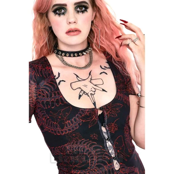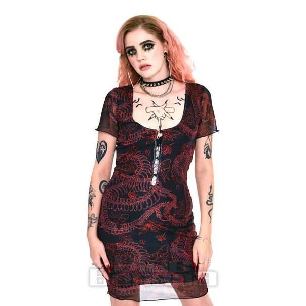Dress it up or dress it down, the Jawbreaker Snake Skeleton Mesh Dress is the perfect choice for your wardrobe! Complete with mesh overlay and button-up detail in the front.