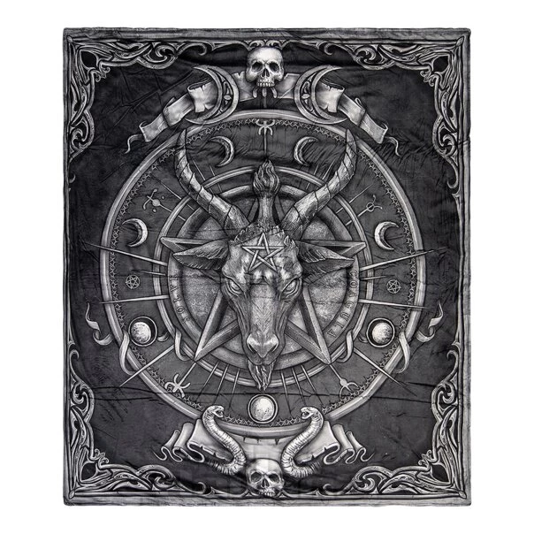 Gothic Baphomet Throw blanket from Nemesis Now in black. Available in size 160CM. This Baphomet throw feature the horned sabbatic goat head mounted on a pentagram with a gothic moon background. This gothic blanket would make a great gift for any alternative individual.