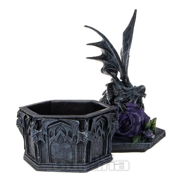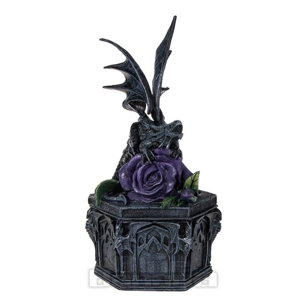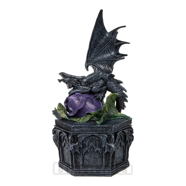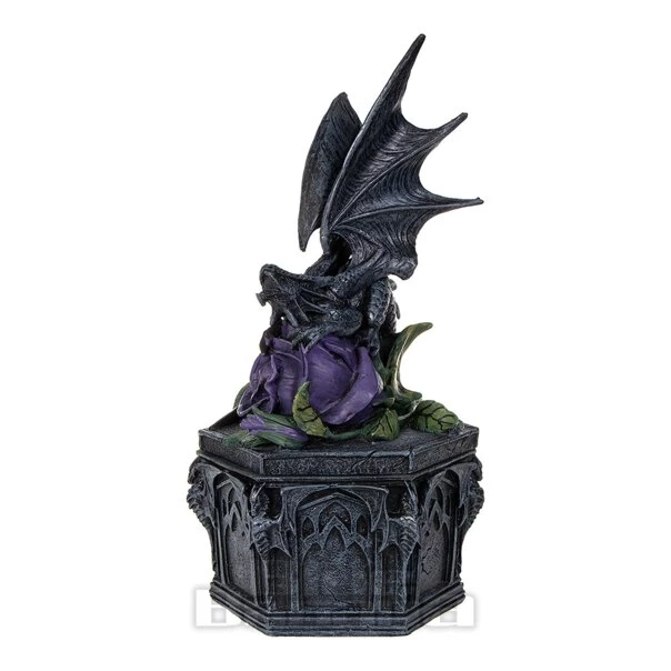 The Dragon Trinket Box from Nemesis Now. Available in 25 CM. This gothic ornament features a black dragon sat upon a purple rose guarding a chamber. This figurine would be ideal in any gothic home.