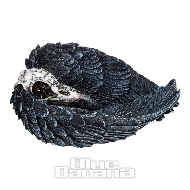 The Nemesis Now Edgars Raven Trinket Holder in 17cm. This stunning Gothic dish ornament features two crossed wings in black with a raven skull, perfect for completing your alternative home decor. This figurine is made from resin.