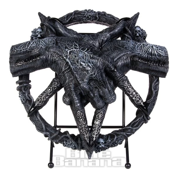Gothic Hold of Baphomet Plaque from Nemesis Now in black. This occult ornament features two connected hands, in a horned gesture position with Baphomet symbol on top of the hand. With vines, tiny skulls and pointed claws, this Baphomet themed standing plaque would make a great addition to any gothic home.