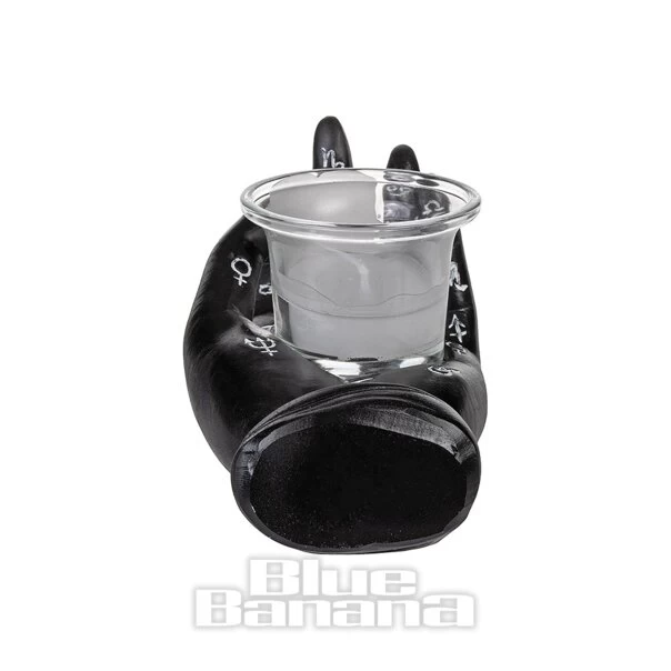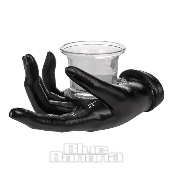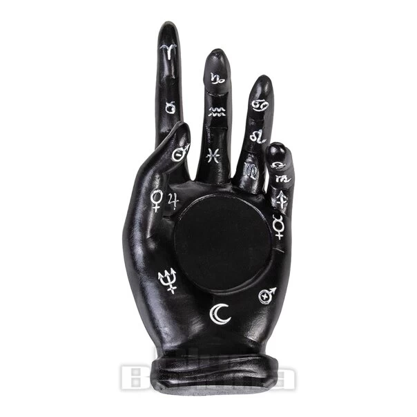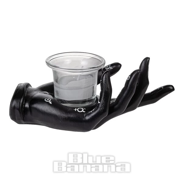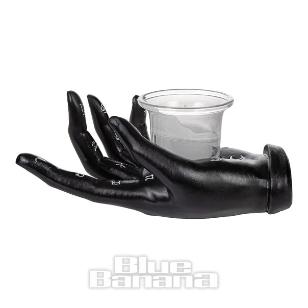 The Nemesis Now Palmists Prediciton Candle Holder in Black. Available in One Size. This occult candle holder features a hand, hand-painted black with silver palmist symbols and cradling a glass holder and candle. This candle holder from Nemesis Now would be perfect for any gothic individual wanting to decorate their home.