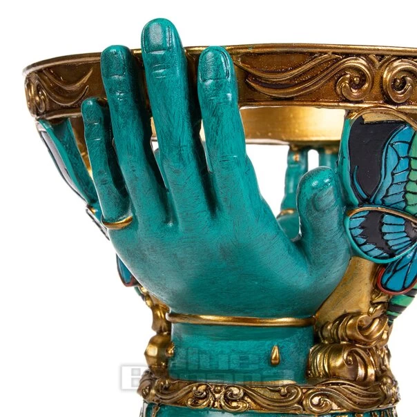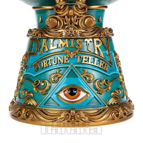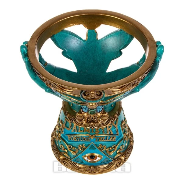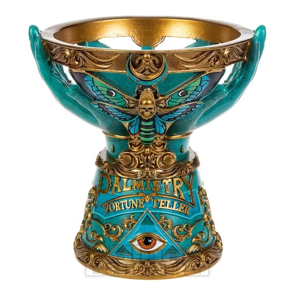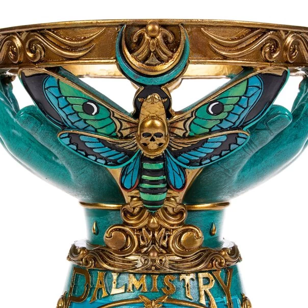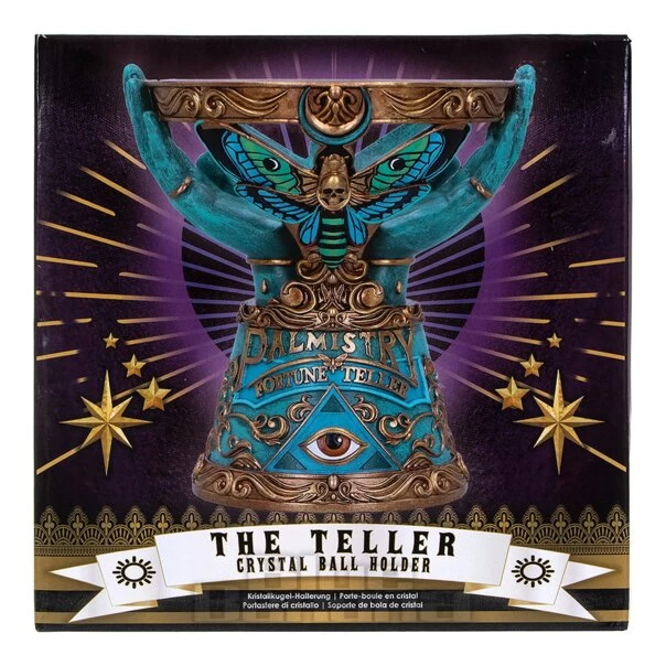 The Teller Crystal Ball Holder from Nemesis Now. Available in 15 CM. This gothic ornament features palmistry symbols, an all-seeing eye and a colourful death moth. This witchy ornament goes perfectly with a crystal ball. Crystal ball not included.