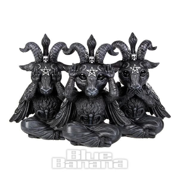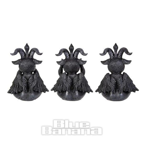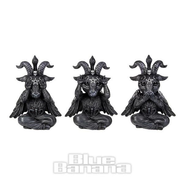 The Nemesis Now Three Wise Baphoboo Figurines in 13.4cm. This trio of ornaments features Baphomet, the goat deity in the classic See No Evil, Hear No Evil, Speak No Evil poses. A perfect gift for a fan of alternative Gothic home decor.