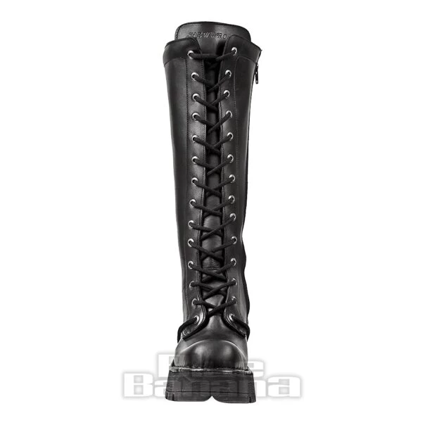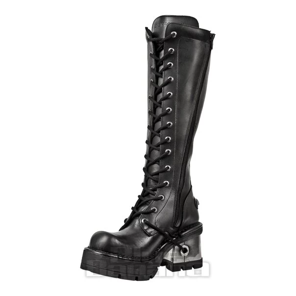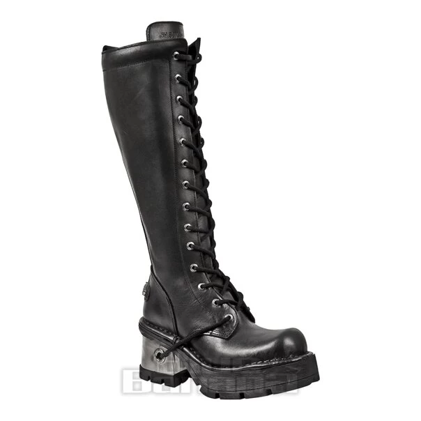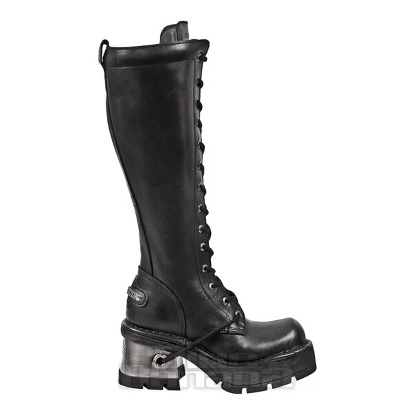 The New Rock M.236-S1 M8 High Boots in black are knee high boots with the original New Rock metallic heel. The lace-up look and smooth leather finish give an iconic alternative New Rock aesthetic.