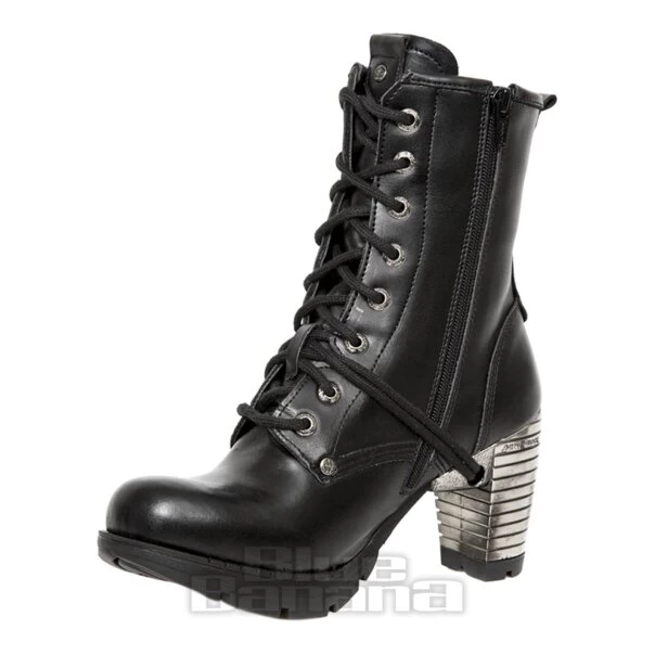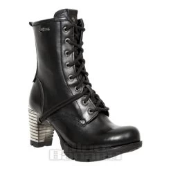 The New Rock M-TR001-VS56 Vegan Heeled Boots in Black. These vegan boots feature a metal heel, dual zip and lace fastening as well as New Rock’s eco-vegan microfibre construction.