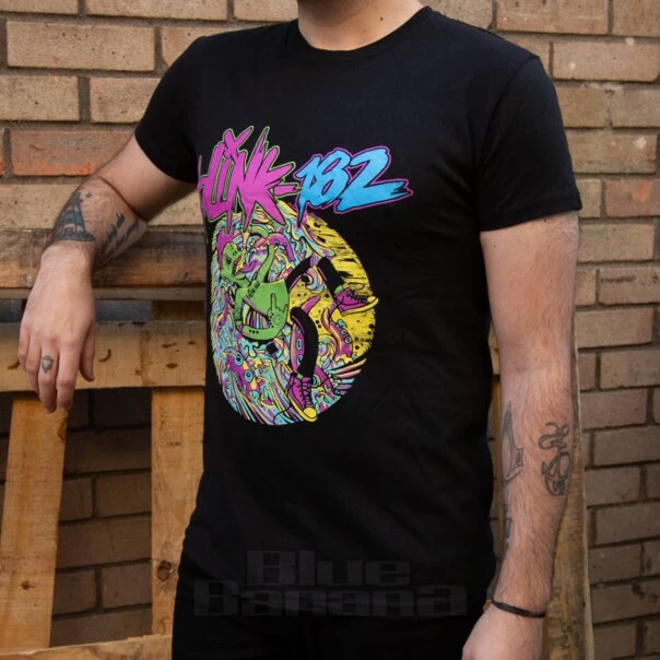 The Official Blink 182 Overboard Event T Shirt in Black. Available in sizes S – XL. This band merch tee features an awesome multicoloured punk graphic with Blink 182 text. For fans of the band, this licensed T shirt is a must!