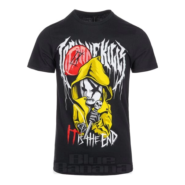 Fans of Ice Nine Kills will love this Yellow Coat T-shirt. Featuring a skull character in a yellow coat, this band tee pays homage to the IT horror franchise.